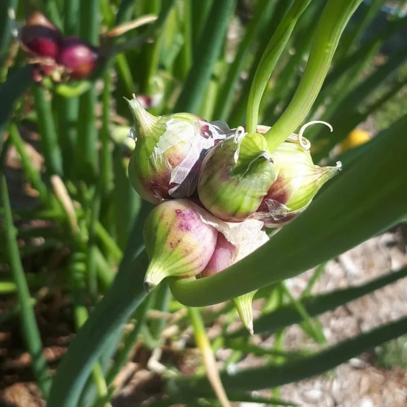 Egyptian Walking Onions are incredibly easy to grow. They thrive in a variety of soil conditions and require minimal maintenance. Plant the bulbils in well-drained soil and provide them with plenty of sunlight. They are also very cold hardy, making them suitable for a wide range of climates. The unique flavor of Walking Onions is similar to that of regular onions, but with a slightly sharper taste, perfect for adding a zing to your culinary creations. Growing walking onions bulbs provides a continuous supply of onions, as the bulbils can be harvested and used in cooking or replanted to expand your onion patch.